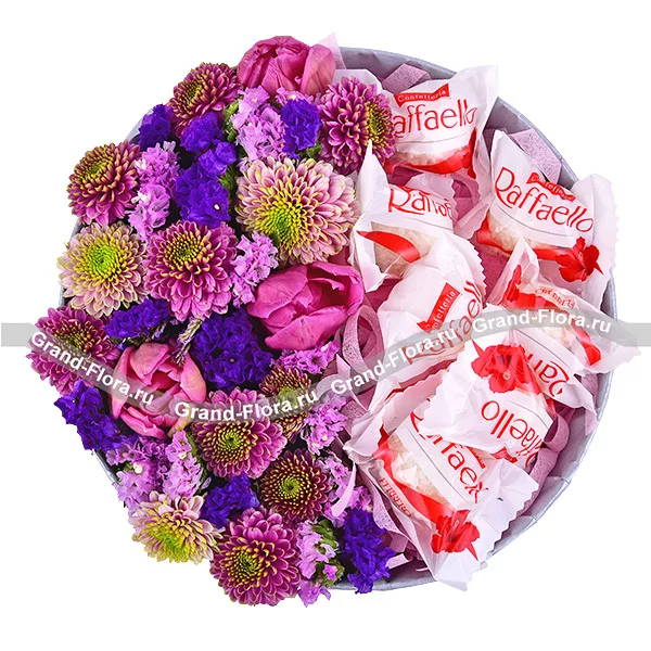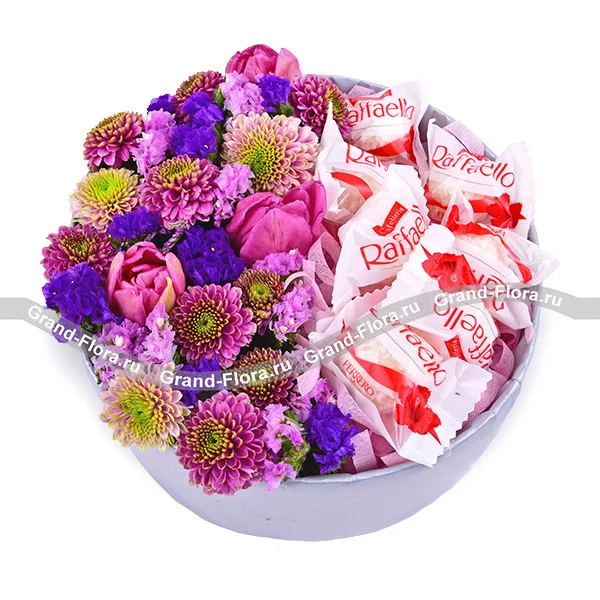 Стандартный: тюльпан розовый - 3 шт., хризантема кустовая - 2 шт., статица розовая и фиолетая., конфеты "Raffaello" - 80 гр., оазис, коробка. Примерный размер - 15Х15 см.