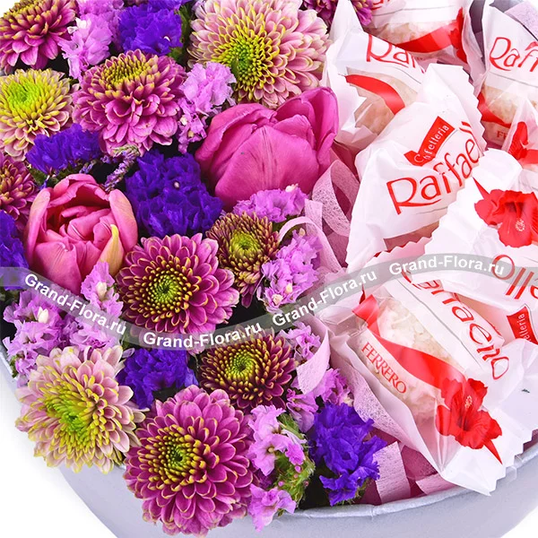 Люкс: тюльпан розовый - 7 шт., хризантема кустовая - 5 шт., статица розовая и фиолетая., конфеты "Raffaello" - 240 гр., оазис, коробка. Примерный размер - 25Х25 см.